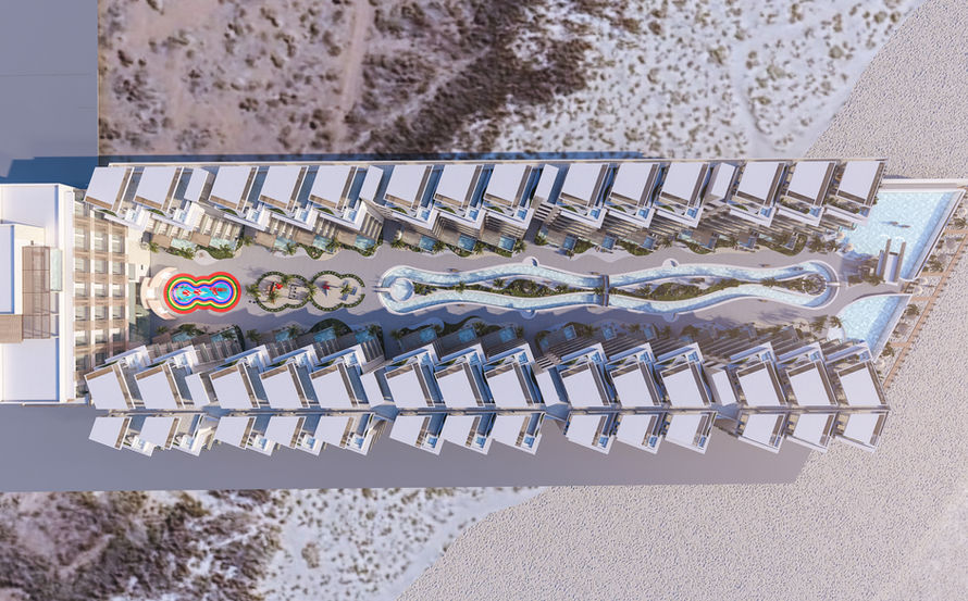 Los edificios residenciales se distribuyen estratégicamente para mantener vistas abiertas hacia el mar y permitir una iluminación natural óptima. La arquitectura utiliza materiales cálidos y texturas que dialogan con el paisaje costero y desértico de la región, creando una imagen contemporánea y atemporal.