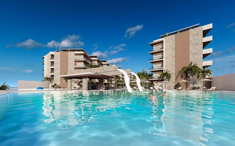 El desarrollo se organiza a partir de un eje central de agua que articula las áreas comunes, jardines y espacios de descanso, generando un recorrido que conecta naturalmente con el mar. La composición arquitectónica privilegia las visuales abiertas, la iluminación natural y la relación constante entre interior y exterior.